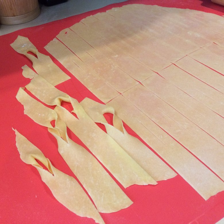 Rozwałkowane placki pocięłam na paski o szerokości około dwóch centymetrów, i każdy na środku przecięłam nożem, robiąc jakby "dziurkę na guzik". Przez tę dziurkę przekładałam połowę paska i tak wychodzą faworki.